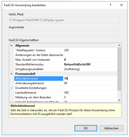 In diesem Fall setzen Sie bitte den Aktivitätstimeout in den FastCGI-Einstellungen hoch: